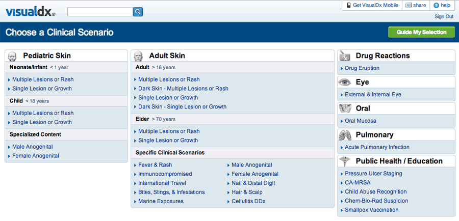 Point of care digital medical image library that aids in the identification of dermatologic, infectious, genetic, metabolic, nutritional and occupational diseases, benign and malignant growths, drug-induced conditions, and other injuries. Users can search by diagnosis, build a patient-specific differential, or look up drug-induced adverse reactions by medication. |